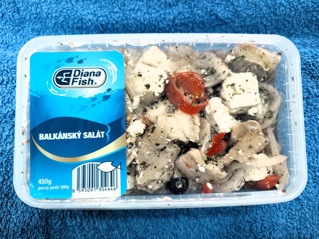 salát ze sleďů, zeleniny, oliv a balkánského sýra