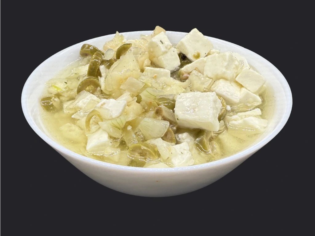 Naše cesta k tomuto lahodnému sýru začíná na slunných svazích, kde se pěstují ty nejkvalitnější olivy. Každá oliva je pečlivě vybrána a zpracována, aby zachovala svou přirozenou chuť a vůni. Cibule a česnek, které používáme, pocházejí z naší vlastní zahrady, kde je pěstujeme s láskou a péčí.