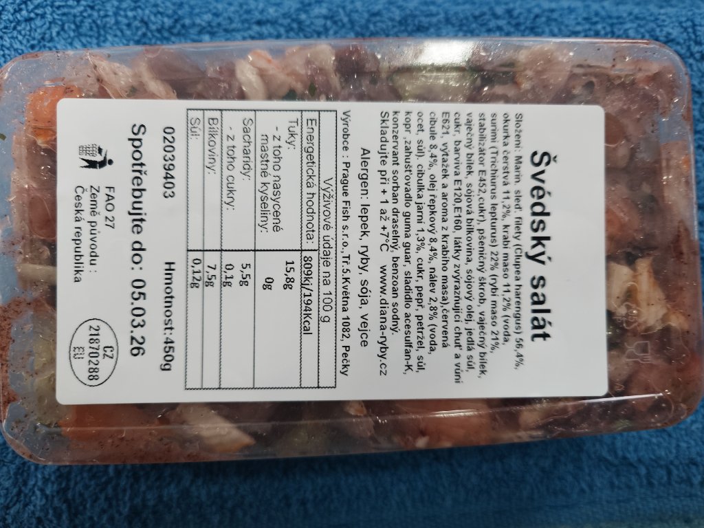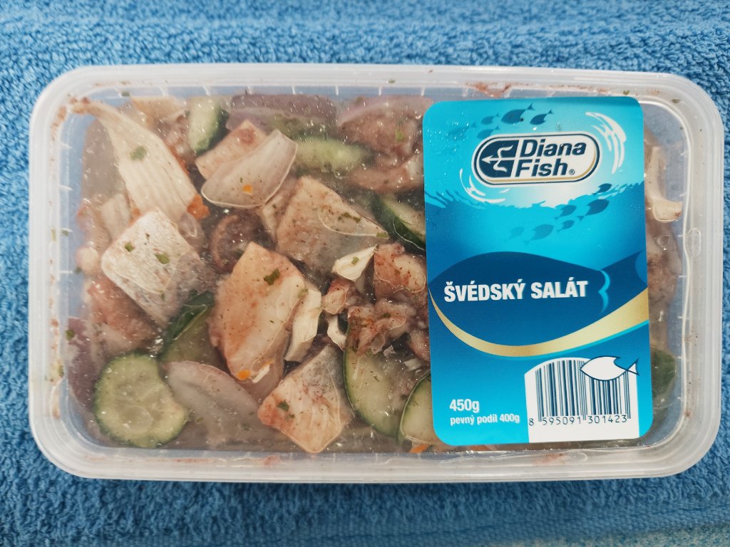 lehký salát ze sleďů, surimi krabího masa a zeleniny
